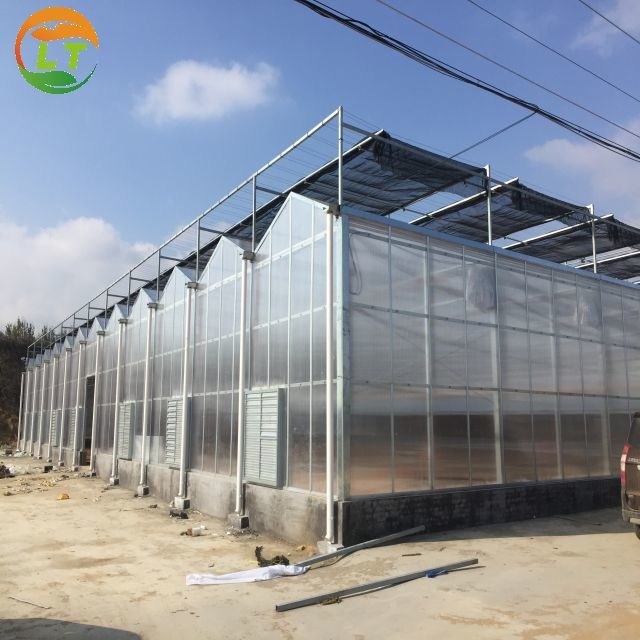 El invernadero de policarbonato tiene una estructura estable, una hermosa forma, una versión lisa, un rendimiento de aislamiento térmico notable, una tasa de transmisión de luz moderada, muchas ranuras de lluvia, una gran extensión,volumen de drenaje, fuerte capacidad de resistencia al viento, adecuado para el área de gran viento y lluvia. invernadero PC tiene buena transmitancia de luz, bajo coeficiente de conducción térmica.larga vida útil, resistencia a la tensión.